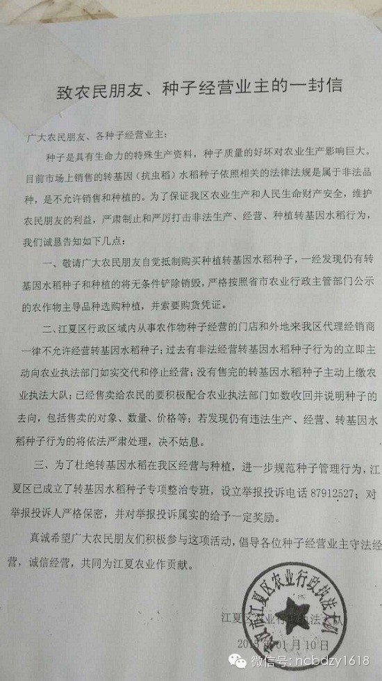 在江夏区农业行政执法大队“致农民朋友、种子经营业主的一封信”中第三条写到,为了杜绝转基因水稻在我区经营与种植,进一步规范种子管理行为,江夏区已成立了转基因水稻种子专项整治专班,设立举报投诉电话87912527;对举报投诉人严格保密,并对举报投诉属实的给予一定奖励。