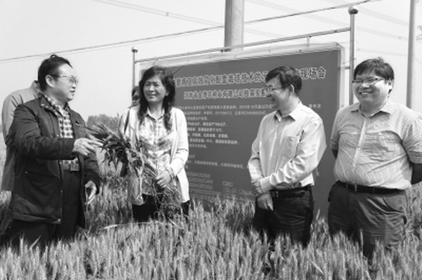 5月16日,优质小麦品种郑麦583良种繁育及高效简化配套栽培技术示范与推广现场会在扶沟县召开。农业部小麦专家指导组副组长郭天财教授,省政府参事、省科技厅原副厅长王志和等小麦专家及种子经销商参加了会议。图为省农科院小麦研究所品种利用研究室赵虹主任(左二)正在向王志和(左一)介绍郑麦583的特征特性。 小金摄