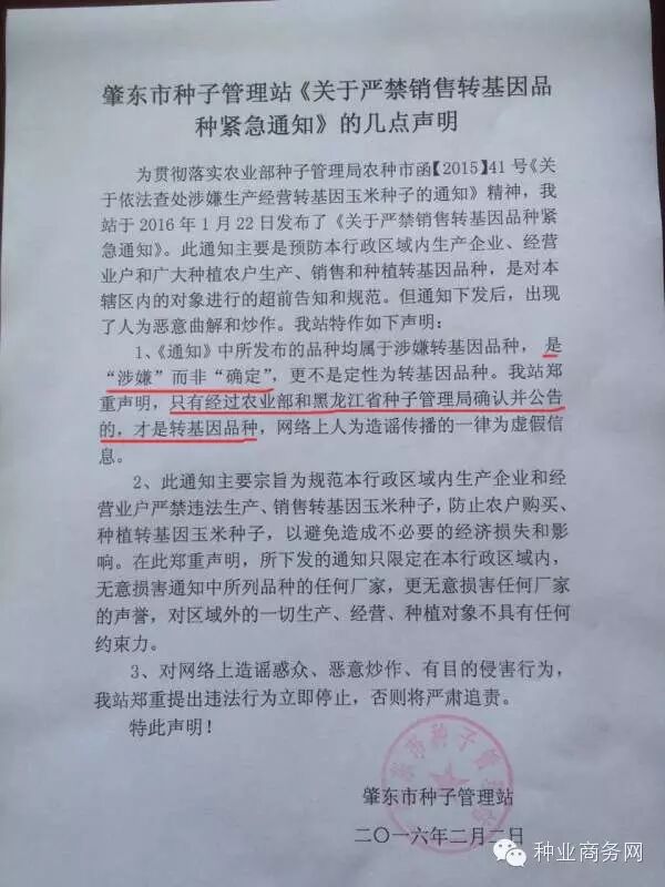 然而,2016年2月2日肇东市种子管理站又发“肇东市种子管理站《关于严禁销售转基因品种的紧急通知》的几点声明”,强调《通知》中发布的品种“均属于涉嫌转基因品种,是“涉嫌”而非“确定”,更不是定性为转基因品种。我站郑重声明,只有经过农业部和黑龙江省种子管理局确认并公告的,才是转基因品种”等等。