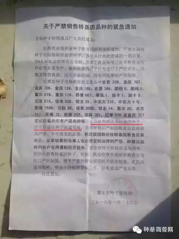 2016年1月12日肇东市种子管理站下发《关于严禁销售转基因品种的紧急通知》称“近期在种子市场销售的玉米品种:世宾338、金庆707、金庆709、金庆129、金庆168、宏晨788、鹏程8、鹏程5、富尔216、富尔116、桥景607、塔玉1、迪卡1、迪卡3、元发815、佳禾558、锦玉29、中农大236、中农大4号、登海3686、元钰66、福星2000、银禾14、聚禾20、禾育187、亚美72、前锋252、远科701、辽单570以及金庆707变名包装的所有产品名称等。经农业部确认为转基因种子,应立即退出种子流通领域,否则种植后产出的粮食会造成极其严重、不可预见的后果”。