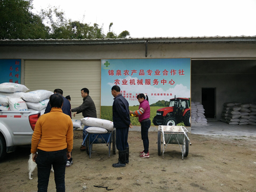 在锦泉农民合作社的农技培训中心免费发放种子肥料。