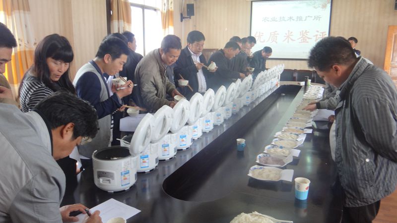 参评的22个样品由农科人员统一编号、统一加工、统一蒸煮,一字排开分稻米和米饭供专家组鉴评。各位鉴评人员对稻米外观和米饭的气味、外观、适口性等方面进行认真观察比较,逐一品尝、记录,对参评稻米的综合品质进行了独立打分。通过评比,评出4个品系品质最好, 5个品系品质较好。
