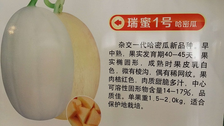 会展期间实物展示和切瓜品尝了‘瑞蜜1号’白皮橙肉和‘白玉翡翠’白皮绿肉厚皮甜瓜,‘瑞蜜1号’质脆多汁、甘甜可口,糖度竟达到了17%,众多经销商品尝后称赞有佳之余还表达了强烈的经销和推广愿望。