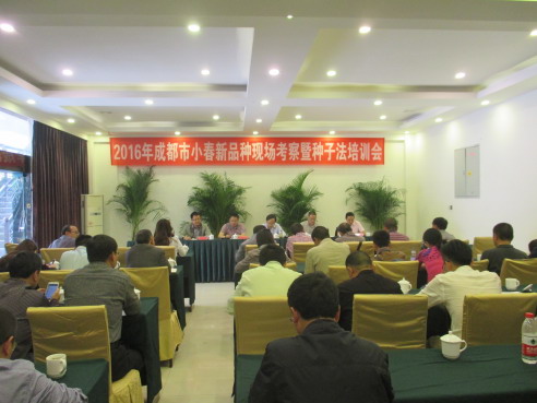4月27日,成都市在温江区召开2016年小春新品种现场考察暨种子法培训会。市农委总农艺师姚光贵、省种子站副站长梁南山出席会议,市种子站负责同志主持会议,市农技总站、市植检站等部门,中科院成都生物所、市农林科学院作物所等科研院所,二三圈层各区(市)县种子管理部门以及种业企业负责人参加会议。(成都市种子管理站 供稿)