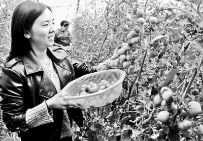 近日,江苏省东海县白塔埠镇前营蔬菜专业合作社生产的绿宝石小番茄上市,供不应求,每公斤售价高达二十元。绿宝石小番茄为北京农林科学院蔬菜研究中心最新选育绿熟特色一代杂交小番茄品种。果实圆球形,绿色透亮似绿宝石,单果重20克左右,果味酸甜浓郁,口感极佳。图为游客在采摘成熟的果实。 徐黾李本连摄