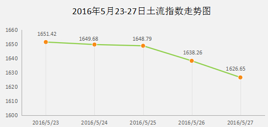 本周期末(2016年5月27日)的1626.65比上期期末(2016年5月13日)的1648.085下降1.3个百分点,比去年同期上涨14.2个百分点,比年初上涨6.2个百分点。虽然周内指数持续下跌,但跌幅较小,相比去年同期以及本年期初涨势不容忽视,可见,土流指数在整体上升的趋势下,短期内存在跌荡。