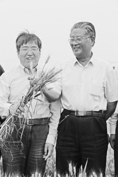 近日,中国农科院作物科学研究所分别在河南省三门峡市、洛阳市和新乡市召开了“中麦895”和“中麦175”小麦品种现场观摩会。图为中国农科院作物科学研究所研究员,国家小麦改良中心主任何中虎博士(左)与全国劳模小麦育种专家郑天存一起观看“中麦895”种植田的长势表现。 孙志刚摄