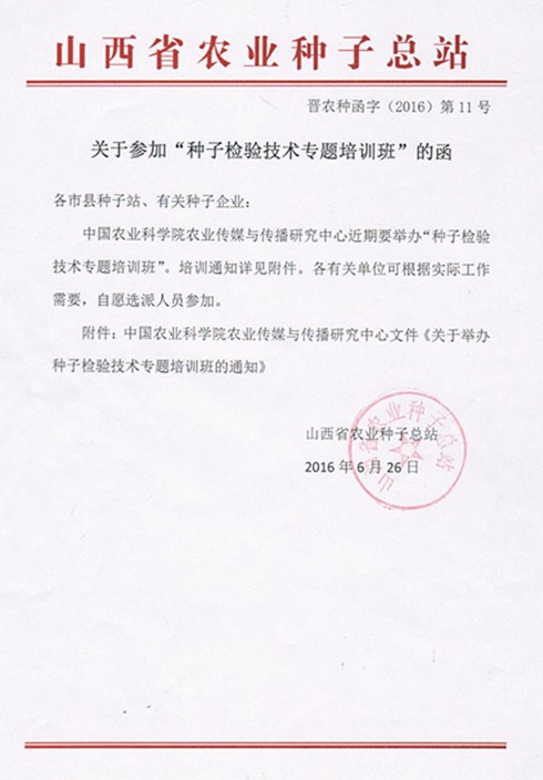 山西省关于参加种子检验技术专题培训班的函