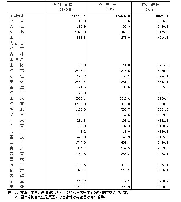 甘肃、宁夏、新疆地区由于小麦成熟较晚,目前夏粮数据为初步预计数。