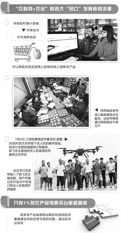 2015年,农产品网络零售交易额达到1505亿元,增长超过50%。阿里巴巴、京东等平台型综合电商持续扩大村级服务站的版图;农商1号、爱种网等农资电商让农民足不出户买农资;顺丰优选、优菜网等生鲜电商满足了城市消费者的尝鲜需求;一亩田、云农场等B2B类农业电商则带动了农产品产销对接……“互联网+农业”的各大“风口”发展都很迅猛。