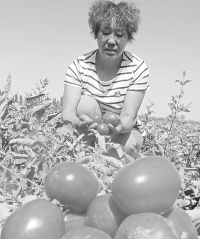 8月10日,新疆生产建设兵团第八师一四三团十三连女职工李士兰正在采摘丰收的番茄,拉开了该团万亩制酱番茄采收的帷幕。该团今年订单种植的1万亩制酱番茄,由于采用移栽苗和膜下节水滴灌先进技术,万亩制酱番茄喜获丰收,单产8吨左右,总产约8万吨。 王仁斯摄