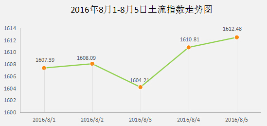 本周期末(2016年8月12日)的1624.31比上周期末(2016年8月12日)的1612.48,上涨11.83个基点。本周土流指数较去年同期(2015年8月12日)上涨9.6个百分点,比年初上涨4.4个百分点。长期来看,土流转数整体上升。