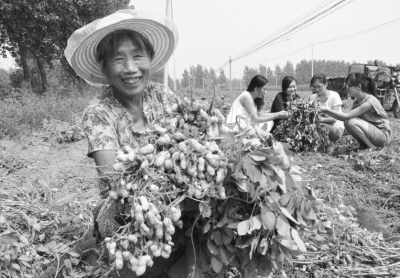 图为东海县农业资源开发项目区77岁钮爱花大婶高兴地说:“‘液膜’加早熟良种无公害花生环保又高产。”