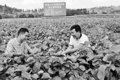 8月19日,湖南省隆回县麻塘山乡横排村大学生周建国(左)与该乡农业综合服务站站长杨思源在猕猴桃苗圃基地察看苗木长势和交流栽培管理技术。周建国2010年大学毕业后,回乡自主创业栽培了200多亩优质猕猴桃,嫁接培育了翠玉、东红、金艳、黄金果、翠香等6个猕候桃系列优良品种,苗木通过网络平台销往全国各地。 贺上升摄