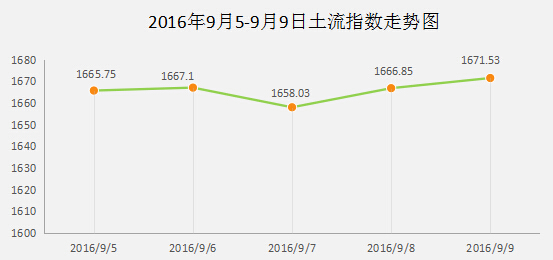 本周期末(2016年9月9日)的1671.53比上周期末(2016年9月2日)的1665.75,上涨5.78个基点,涨幅为0.3%。本周土流指数较去年同期(2015年9月9日)上涨8.3个百分点,比年初上涨7.5个百分点。土流指数整体呈现上升趋势。