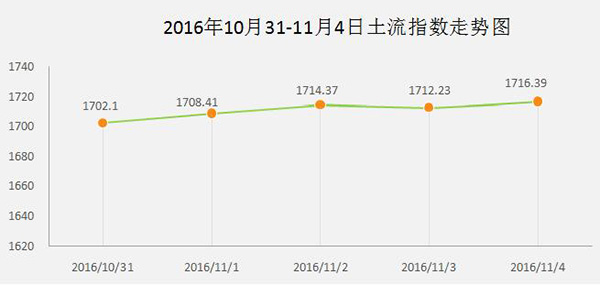 本周期末(2016年11月4日)的1716.39比上周期末(2016年10月28日)的1713.87,上升3个基点。本周土流指数较去年同期(2015年11月4日)上涨10个百分点,比年初上涨10.3个百分点。土流指数整体呈现上升趋势。