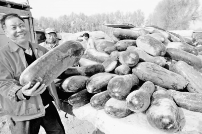 10月31日,新疆库尔勒市二十九团棉农王浩在采收黑皮大冬瓜正装车销售。今年,王浩将种了10多年的30亩