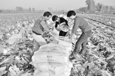 11月7日,河南省商丘市夏邑县李集镇郭庄村农民正在收获大白菜。今年,该县政协驻村扶贫工作队引导村民调整种植结构,一年三茬种植