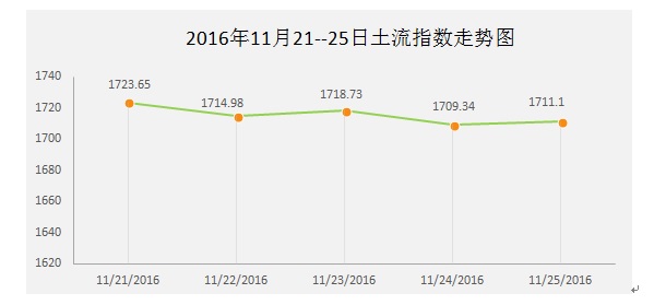 本周 “土流网·土地流转指数”从2016年11月21日的1723.65到2016年11月25日1711.1,下滑12.55个基点,降幅为0.73%。