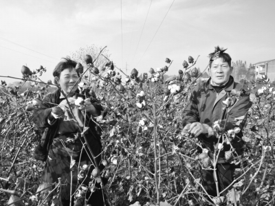 华杂棉H318新棉种。在经历罕见的旱涝灾害后,由于抗灾得力,每亩已收籽棉550斤,地里棉株上还有很多秋桃,每亩还可收籽棉100多斤,亩收入过2000元,图为老两口11月29日喜采优质棉。余宏章摄