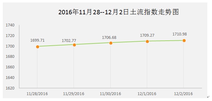 本周“土流网·土地流转指数”从2016年11月28日的1699.71到2016年12月2日1710.98,上升11.27个基点,涨幅为0.66%。