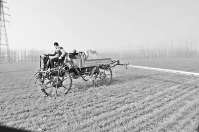 12月7日,安徽省宿州市埇桥区顺河乡风光家庭农场在给麦田喷洒除草剂。祝家刚摄