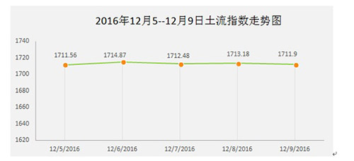 本周土流指数日均为1712.80,较上期1705.88的上涨6.91个基点。本周期末土流指数较去年同期(2015年12月9日)上涨5.8个百分点,比年初上涨10.1个百分点。“土流网?土流指数”整体呈现上升趋势。