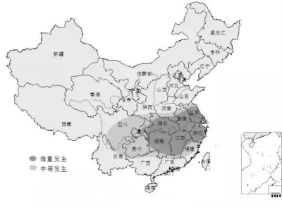 重发区:以长江流域秋播油菜产区湖北、湖南、安徽、江苏、江西为菌核病重发区,注意重点防控。