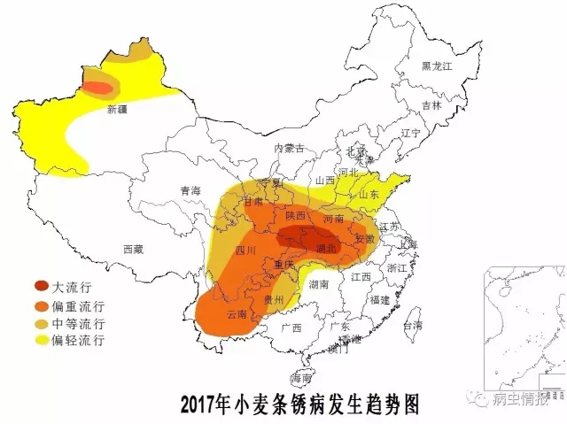 总体偏重发生,重于上年和近年,发生面积约5000万亩。其中,汉水流域大发生,西南大部、黄淮南部和西北东南部及新疆北部偏重流行,黄淮北部和西北部分麦区中等流行,华北等其他麦区偏轻发生。流行盛期,西南和汉水流域为4月份,黄淮和华北南部为4月中旬至5月中旬,西北冬麦区为5月中旬至6月中旬、春麦区为6月下旬至7月下旬。