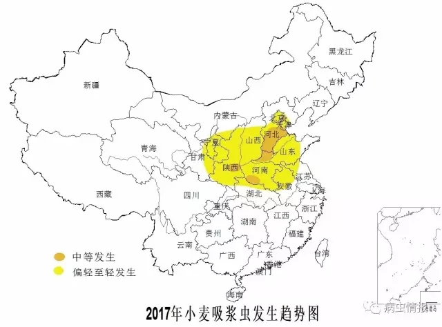 总体偏轻发生,接近上年,轻于常年,发生面积2600万亩。其中,北京、天津、河北、陕西、河南、山东等省(市)部分麦区局部地块可能出现严重为害。成虫羽化盛期为4月中旬至5月上旬。