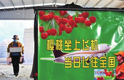 眼下正是山东大樱桃成熟上市时节,山东沂源许多果农和经销商采取航运方式进行快运外销,国内大部分地区实现36小时到达。据当地农业部门介绍,该县每天有5万多公斤大樱桃通过航运销往全国。图为5月23日,在山东省沂源县历山街道北大岩村,一名果农搬运准备航运外销的大樱桃。 赵东山摄新华社发