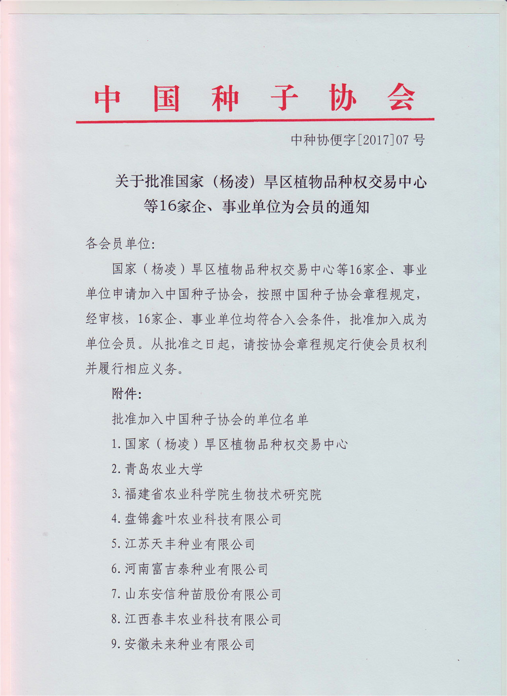 中种协批准国家(杨凌)旱区植物品种权交易中心等16单位为会员