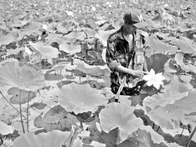 福建省连城县姑田镇城兜村贫困户陈权,受益于镇人大代表和挂钩干部的帮扶,在镇科普惠农服务站的指导下,引种台湾白花莲20余亩获得成功。图为日前陈权在莲子田观察莲