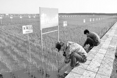 高产栽培技术研究,对龙粳31、龙粳46、垦稻31等优质水稻品种进行肥效、抗病、产量等方面的试验,为农业生产实现高产高效奠定了基础。图为技术人员在查看试验水稻生长情况。
