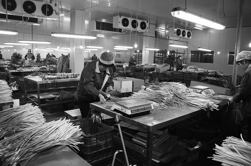 ▲美东农业的蔬果加工车间里,工人们正在分拣净选、包装蔬菜。