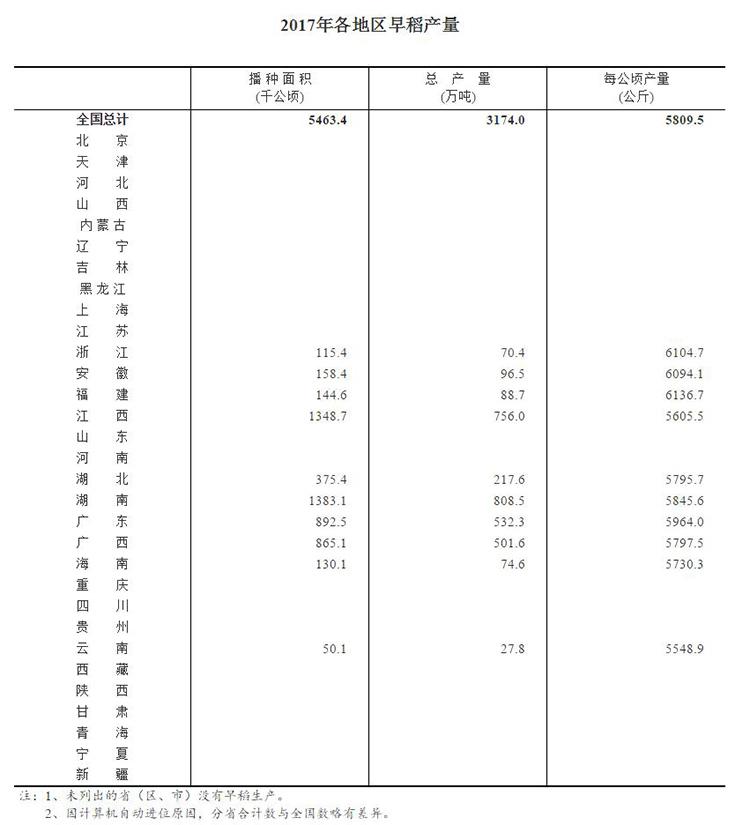 经济日报-中国经济网北京8月28日讯 据国家统计局网站消息,根据对早稻主产区的实割实测抽样调查和非主产区的重点调查,2017年全国早稻播种面积、单位面积产量、总产量如下: