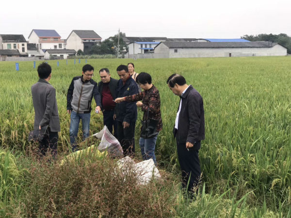 图为 专家组在汨罗市新市镇机插同步精量一次施肥中稻试验田进行测产