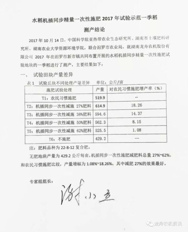 自研发伊始,湖南龙舟农机股份有限公司就在湖南多地开展了水稻插秧同步精量施肥机的减肥增产试验,并在今年由专家组进行了多次测产。