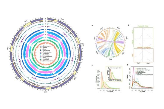 近年来,该团队利用二代、三代等测序技术与最新的组装技术,对D基因组重新测序与组装,将组装质量提高210 倍,完成了染色体级别的D基因组精细图谱的绘制。利用高质量的组装结果,准确地进行了基因注释,构建了基因分布图、基因表达图、假基因分布图、重复序列分布图、甲基化分布图、重组率分布图和smallRNA分布图。研究发现,粗山羊草基因组中有一批基因在近期发生了复制。研究还重点分析了转座子对基因组结构、基因复制、假基因形成与基因表达的影响,发现有近1/2的基因中携带有TE,是已测序基因组中携带TE基因最多的物种,也是迄今为止报道的假基因数量最多的物种。TE通常还抑制基因的表达。该研究还首次把近30年来三代分子标记和之前检测到的重要农艺性状基因和QTL定位到小麦D基因组上,获得一个完整的整合图谱。