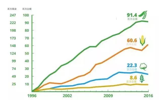 要点:有统计数据显示,转基因作物在21年的商业化进程中,种植面积从1996年的170万公顷迅速上升到2016年的1.851亿公顷(编者注:27.75亿亩),实现了110倍的增长。