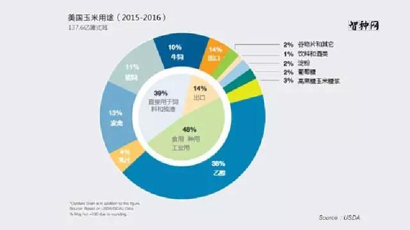 籽粒玉米可分为高淀粉、高油、高蛋白、高赖氨基酸、高直链淀粉、高支链淀粉。现在美国禁止对我国出口高直链玉米,只允许出口高直链淀粉,每吨价格也在近二万元左右。为什么?因为高直链淀粉不仅可以用于生物解膜,还是大量新科技产业化的主要物质原材料之一。目前玉米消费主要包括三大部分,一个是饲用需求,一个是工业需求,一个是食用需求。根据中粮期货研究院测算,每年我国饲用玉米需求量在 1.1-1.2 亿吨左右,其中猪料需求占 60% 以上,但是美国现在猪用饲料采购的商品玉米都是软质胚乳,老外叫蜡质玉米,因为好消化,易吸收。根据测算,生产吨燃料乙醇消耗玉米约 3.1 吨,且对玉米品质无明显要求。中国乙醇消费占玉米消费比约为 2.4%,美国燃料乙醇玉米消费占整体比例达到 38%,所以我国燃料乙醇玉米消费存在巨大市场空间。高直链玉米用来生产变性淀粉,变性淀粉可用做光降解的塑料制品和 3D 打印材料、有机玻璃等等。