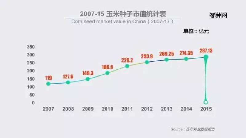 玉米种子市值从 2007 年的 119 亿元增长到 2015 年的 287.13 亿元,9 年年均复合增长率达到 11.64%。2015 年七种主要农作物种子市值达到 840 亿元,其中小麦种子市值 153.83 亿元,常规稻 55.75 亿元,杂交稻124.94 亿元,大豆 24.16 亿元,马铃薯 160.18 亿元,棉花 22.03 亿元,油菜 12.25 亿元,玉米种子市值超过 1/4。