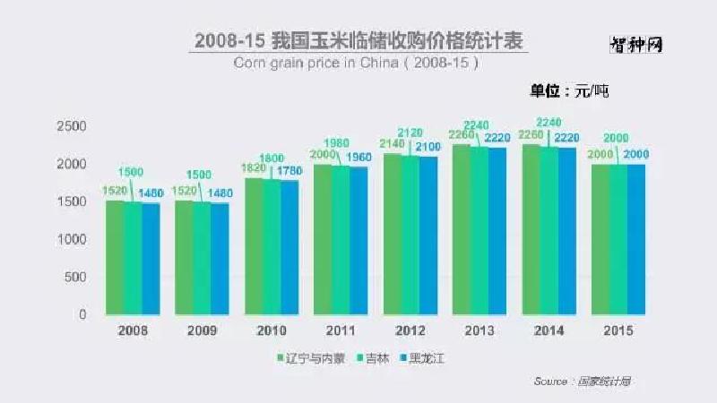 国家于 2008 开始在东北实施玉米临储政策,实施的 8 年以来,商品玉米价格稳步上扬。由 2008 年的 0.74-0.76 元一路上扬至 2014 年的 1.11-1.13 元,涨幅高达近 50%。商品玉米临储价格 7 年年均复合增长率达到6.83%-6.99%,上涨幅度惊人。同时,因为东北玉米临储价格“只涨不跌”,临储数量也从一开始设计的有限收购变成了敞开式收购,这样就造成了下游企业成本居高不下和财政资金的不堪重负,于是国家于 2015 年下调东北玉米临储价格,并于 2016 年开始取消东北玉米临储政策。