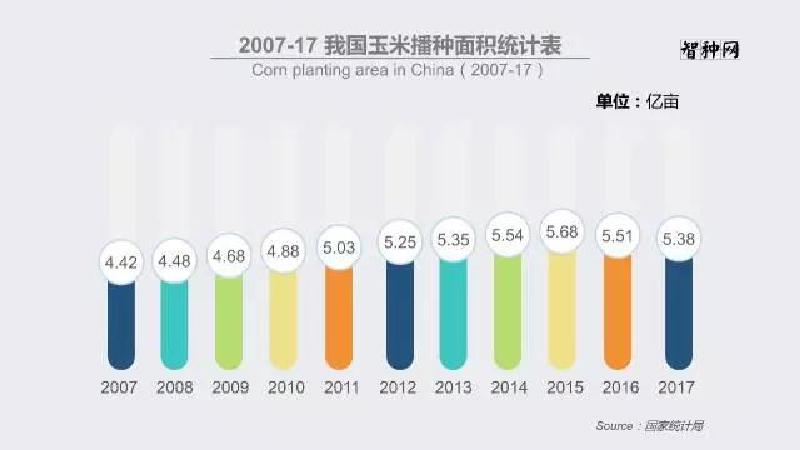 2007-2015 年我国玉米播种面积由 4.42 亿亩增加到 5.68 亿亩,播种面积9 年年均复合增长率达到了 3.18%。然后从 2016 年开始,玉米播种面积由5.51 亩下降到了 2017 年的 5.38 亿亩,达到了 2013 年玉米播种面积水平,但是仍然是我国播种面积和产量双第一的农作物。