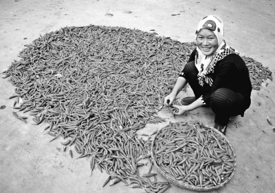今年贵州省威宁自治县中水镇银水村种植的单生指天椒喜获丰收,椒农们忙着采摘、装袋、销售,不亦乐乎,红彤彤的单生指天椒为群众致富添了新门路。据椒农们介绍,单生指天椒产量高,平均亩产达1200多公斤,鲜椒按照每公斤2.4元的价格全部由经销商收购,亩产值超过3000元。 刘军林摄
