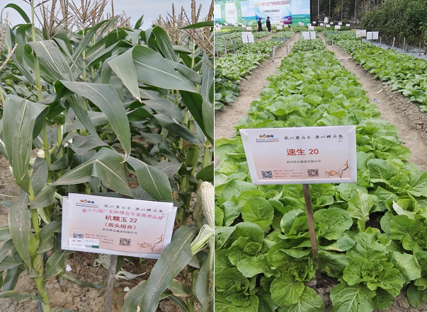 杭州种业集团有限公司党委副书记吴杰率杭州利丰种子有限公司和集团电商部强大阵容,同时亮相柯木塱基地与广州种业小镇分会场。不仅在田间现场展示鲜食玉米‘天糯828’、‘杭糯玉21’、‘杭玉甜12’、‘沪紫黑糯1号’和叶菜‘速生20’、‘杭绿2号’等10个新品种,而且分别在两个展馆宣传、展示、推介集团公司的农作物新品种、城市园艺和咿芽农场产品,集团公司推出的鲜食玉米新品种‘杭糯玉22’入选组委会5个糯玉米“专家推荐品种”之一。
