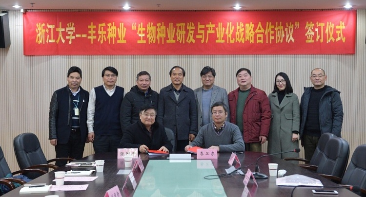 1月4日,合肥丰乐种业股份有限公司与浙江大学在杭州签订“生物种业研发与产业化战略合作协议”。丰乐种业常务副总经理罗松彪、副总经理李卫东,浙江大学农业生命环境学部副主任刘建新、浙江大学农业与生物技术学院党委书记赵建明、副院长孙崇德,浙江大学作物科学研究所所长张国平参加了会议。
