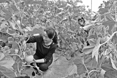 今年,河北省临城县黑城乡积极引导种植户引进种植8000余亩口感脆甜、果肉多、耐贮运的新品种甜瓜,甜瓜亩收入2万多元。如今,该县胶泥沟、支角等20多个村1000余户贫困户通过订单种植新品种甜瓜走上脱贫致富路。图为胶泥沟村成熟的甜瓜引来游客采摘。