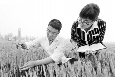 所工作人员正在实地测量“安麦1241”的株高与穗长。