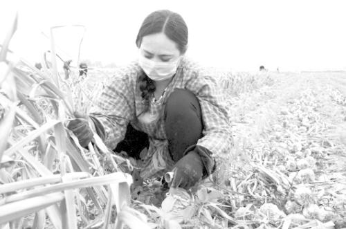 收蒜是个重体力活,一位蒜农在剜蒜。 本报记者 姬生辉 摄